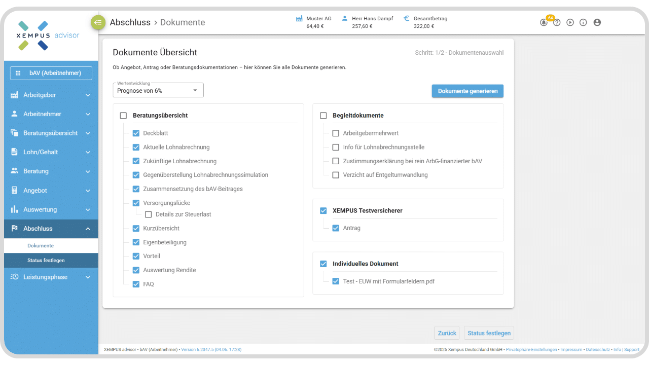 Prozesse, wie die Angebotserstellung oder die Dokumentation waren früher besonders zeitaufwendig. Im XEMPUS advisor können die Beratungsdokumente mit wenigen Klicks generiert werden. Das umfasst die Beratungsübersicht sowie die Versicherer-Dokumente. Des Weiteren können auch individuelle Vorlagen digital erstellt oder hochgeladen werden, die dann zusammen mit den Beratungs- und Versicherer-Dokumenten automatisch generiert und digital unterzeichnet werden können.