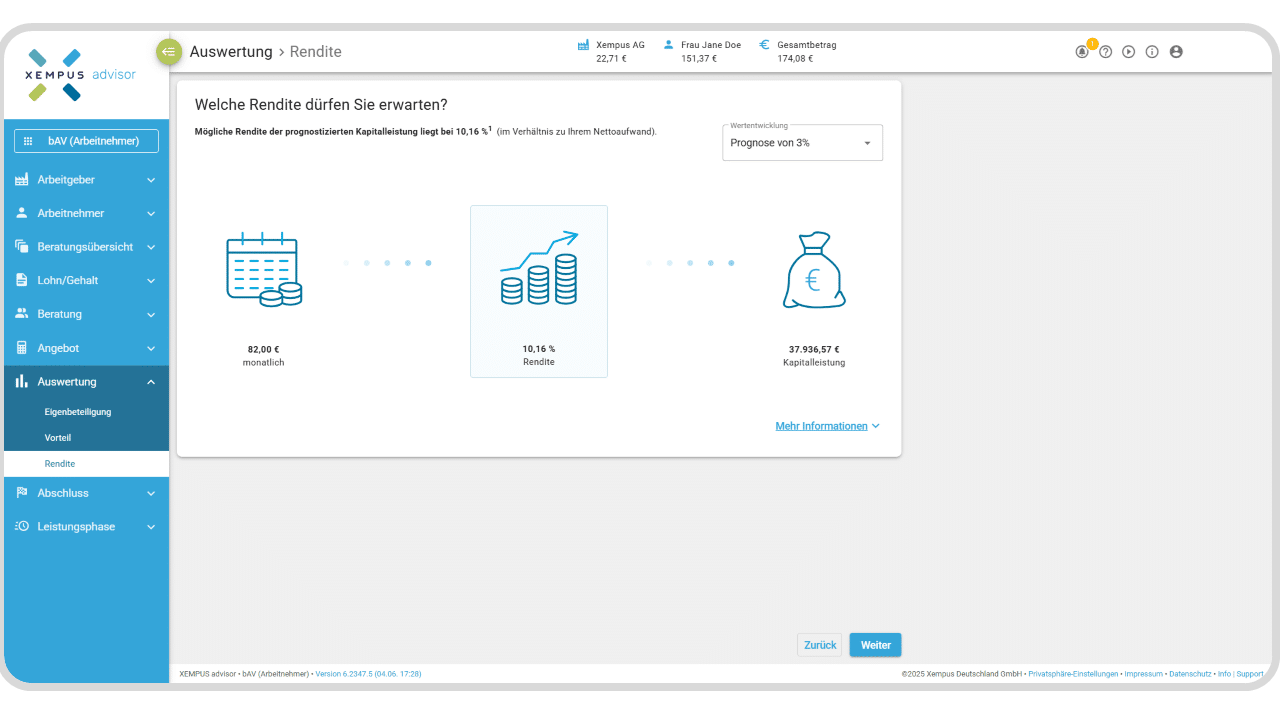 Durch den Einsatz des XEMPUS advisor hat sich das Verständnis und die Entscheidungsfindung der Kunden spürbar verbessert. Viele berichten, dass sie erstmals wirklich nachvollziehen können, wie die bAV funktioniert. Im Gespräch wird der persönliche Mehrwert deutlich, da komplexe Zusammenhänge anschaulich und verständlich dargestellt werden.