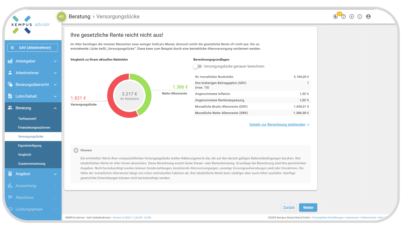 “Vielen Arbeitnehmerinnen und Arbeitnehmern ist gar nicht bewusst, was bei der gesetzlichen Rente netto tatsächlich übrigbleibt. Mit der Berechnung im XEMPUS advisor wird vielen schnell klar, dass sie aktiv werden müssen, um die eigene Versorgungslücke zu füllen. Besonders die Inflation wird oft unterschätzt. Hier sind wir als Vermittler gefragt, wesentlich zur Aufklärung beizutragen.“