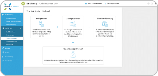 Mit dem XEMPUS advisor läuft heute alles digital und standardisiert: Arbeitgeber werden in wenigen Minuten angelegt, die Beratungsstrecke ist visuell aufgebaut und alle Varianten lassen sich sofort vergleichen – sowohl für den Arbeitgeber als auch für die Mitarbeitenden.